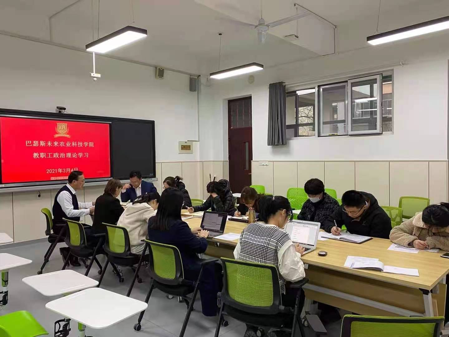 3月4日下午,太阳成集团tyc122cc于教学楼F105开展理论学习中心组暨教职工政治理论学习。会议由公司党总支负责人吕玉亭主持,全体教职工和综合英语教师参加。