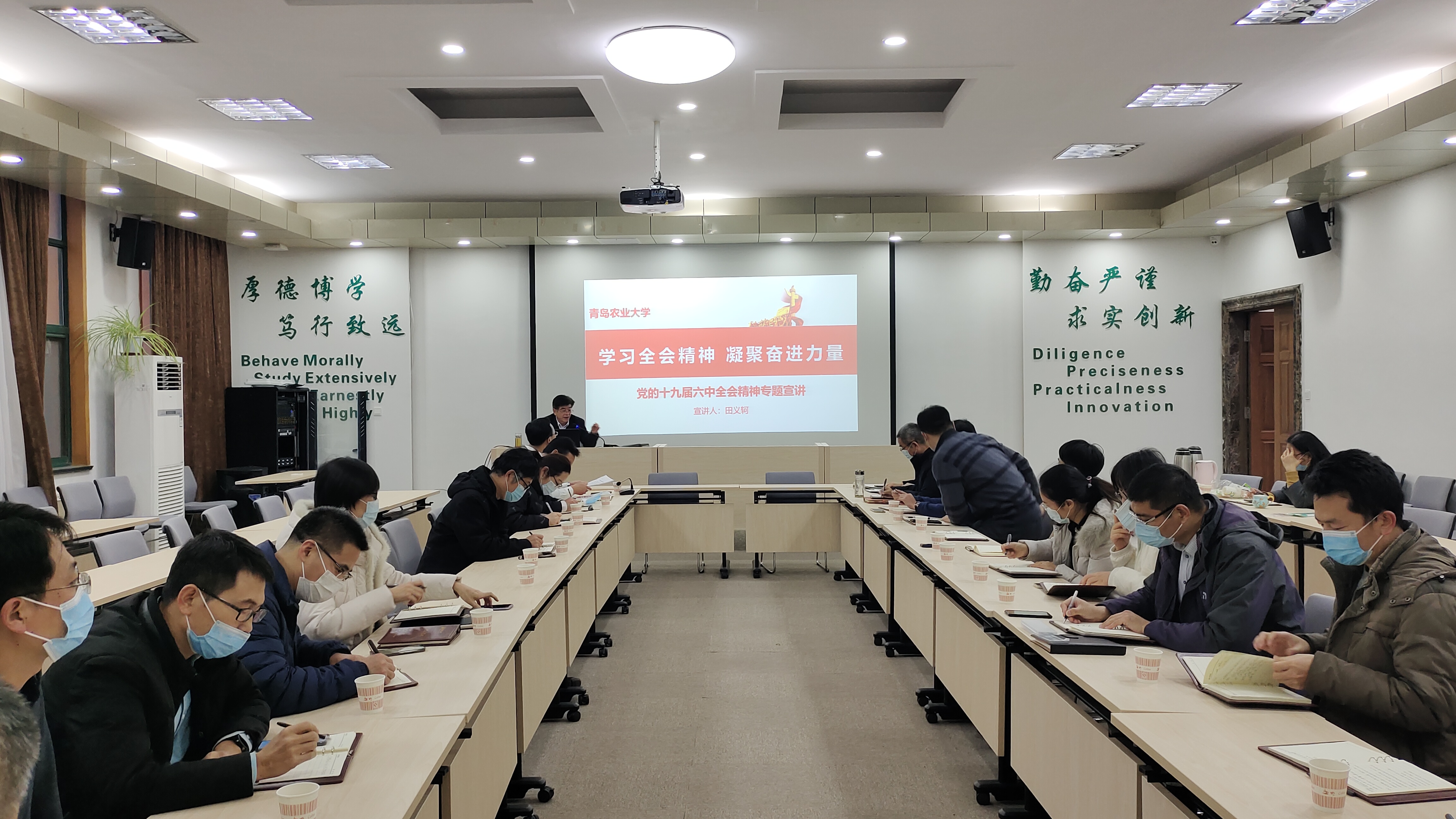 宣讲中,田义轲以《深入学习贯彻党的十九届六中全会精神》为题,从“深刻认识总结党的百年奋斗重大成就和历史经验的重大意义”“深刻认识党的百年奋斗的初心使命和重大成就”“深刻认识中国特色社会主义新时代的历史性成就”“深刻认识党的百年奋斗的历史意义和历史经验”“深刻认识以史为鉴、开创未来的重要要求”“从党的百年奋斗历程中汲取智慧和力量”“推动全会精神在青岛农大落地生根开花结果”等七个方面对全会精神进行了解读和阐释。