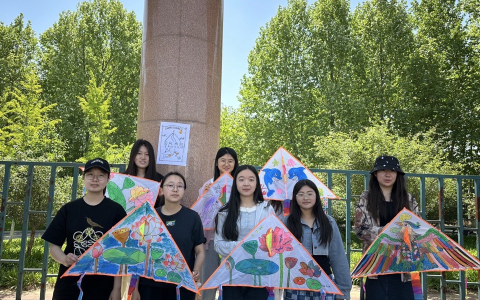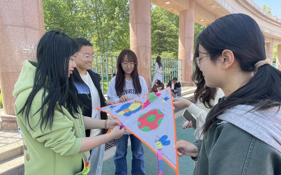 活动设置四个团队项目,2—6人组队即可参与,现场氛围热烈。首个“体质大比拼——背单词接力跑”项目,同学们抽取长单词背诵后跑步传递,最终完成拼写闯关,在运动中检验知识储备;“心灵相通——英文单词你画我猜”通过肢体语言传递词汇信息,既考验词汇量,又拉近同学距离,强化协作表达能力;“英语单词接龙”环节,小组成员接力说出首尾字母相连的单词,十词连贯即挑战成功,充分展现大家的词汇积累;最后“因风而动——中英创作画风筝”项目,同学们融合中英元素创作特色风筝,完成后集体放飞,五彩风筝翱翔天际,彰显青春活力。