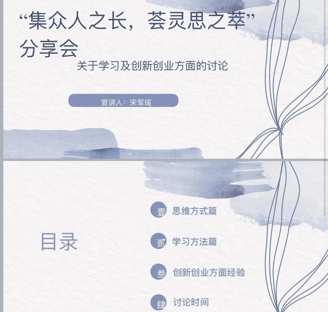 宋军瑶主要从思维方式、学习方法和创新创业三个方面进行了分享,她表示在思维方式上知识无边界、考试无重点,术业有专攻、天赋努力并重。她向同学们介绍了“构建框架-获取知识-反馈输出”的学习方法来让同学们更加全面的了解如何高质量学习。在创新创业方面,她分享了自己参加科创竞赛的经历,介绍了撰写申报书的重点和注意事项。