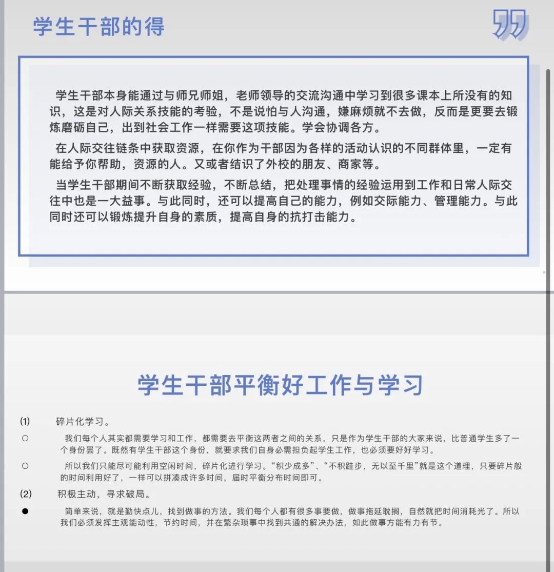 王子铭主要从“什么是员工干部”、“员工干部的本质”以及“如何平衡好工作与学习”等方面进行了分享。他认为,员工干部能通过与老师同学的交流沟通中学习到很多课本上未涉及的知识,这不仅仅是对人际关系技能的考验,也是对自己组织沟通能力、协调能力的锻炼与磨砺。